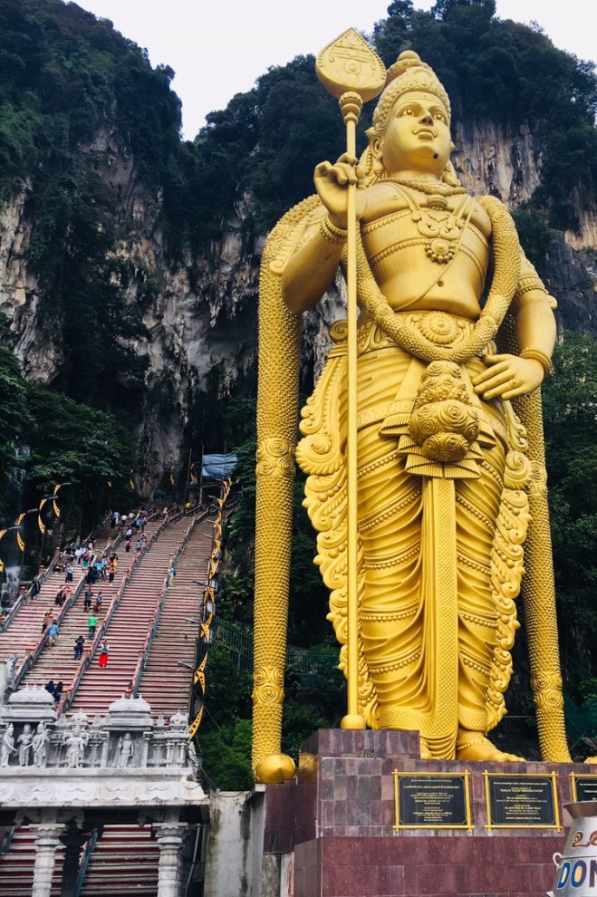 Suspended in the air, I was reminded of our recent trip to some caves in Kuala Lumpur. It took us days to struggle up the steps behind the famous golden statue in order to explore the shrines in the caves above. I think the folk who laid the steps probably ascended that hill faster than us. But then they probably didn’t have a lazy toddler whose legs only work if there’s chocolate on the horizon or two older children terrified of the enormous troupe of feisty macaques who guard the way. And then there was me at the back, struggling in a sarong I’d been forced to hire for the sake of modesty, home to a band of fleas that seemed intent on biting my ankles.