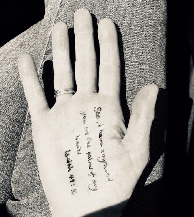 The next day I was reminded of the verse in the Bible that says God will never forget our name, a basic part of parenting that had eluded me. Whilst I may forget my children’s names on a very bad day, God never will. Where do some of us write something when it’s extremely important? On our hands. It seems God invented that. He has all of our names written on the palms of his hands: