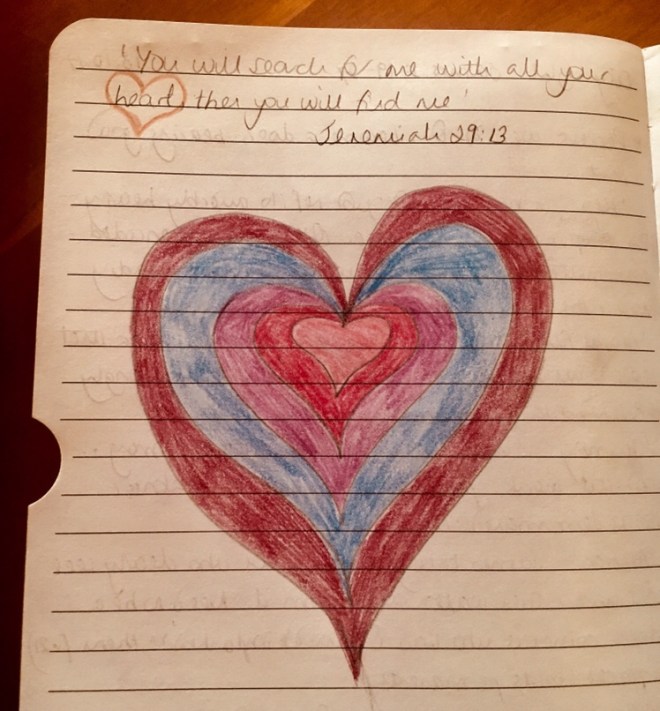 When I got home, I googled ‘Bible journaling’, read up about it, found a notebook and got out some pencils.  That night, we started.  We discovered we love it!   We have done it 3 or 4 times since.  And without wanting to overplay it, the result has been miraculous.